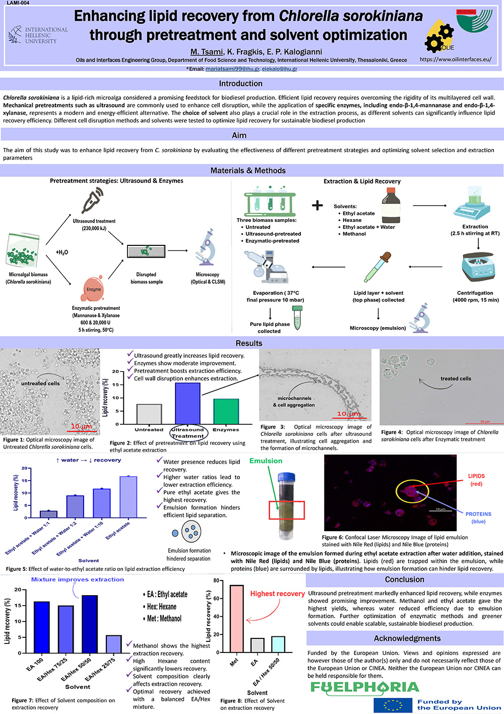 Chlorella sorokiniana is a lipid-rich microalga considered a promising feedstock for biodiesel production. Efficient lipid recovery requires overcoming the rigidity of its multilayered cell wall. Mechanical pretreatments such as ultrasound are commonly used to enhance cell disruption, while the application of specific enzymes, including endo-β-1,4-mannanase and endo-β-1,4- xylanase, represents a modern and energy-efficient alternative. The choice of solvent also plays a crucial role in the extraction process, as different solvents can significantly influence lipid recovery efficiency. Different cell disruption methods and solvents were tested to optimize lipid recovery for sustainable biodiesel production.