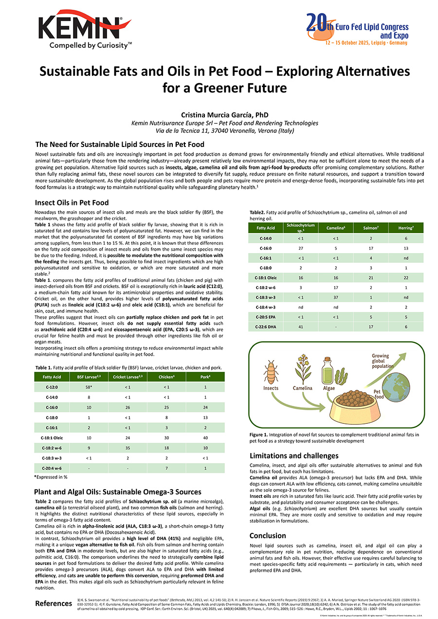 Novel sustainable fats and oils are increasingly important in pet food production as demand grows for environmentally friendly and ethical alternatives. While traditional animal fats—particularly those from the rendering industry—already present relatively low environmental impacts, they may not be sufficient alone to meet the needs of a growing pet population. Alternative lipid sources such as insects, algae, camelina oil, and oils from agri-food by-products offer promising complementary solutions. Rather than fully replacing animal fats, these novel sources can be integrated to diversify fat supply, reduce pressure on finite natural resources, and support a transition toward more sustainable development. As the global population rises and both people and pets require more protein and energy-dense foods, incorporating sustainable fats into pet food formulas is a strategic way to maintain nutritional quality while safeguarding planetary health. This review examines the role of these sustainable fats in pet food, their nutritional benefits, and their potential to reduce the environmental impact of pet food manufacturing. Furthermore, this work underscores the role of consumer acceptance and advanced processing technologies in promoting the use of these sustainable ingredients in pet food.