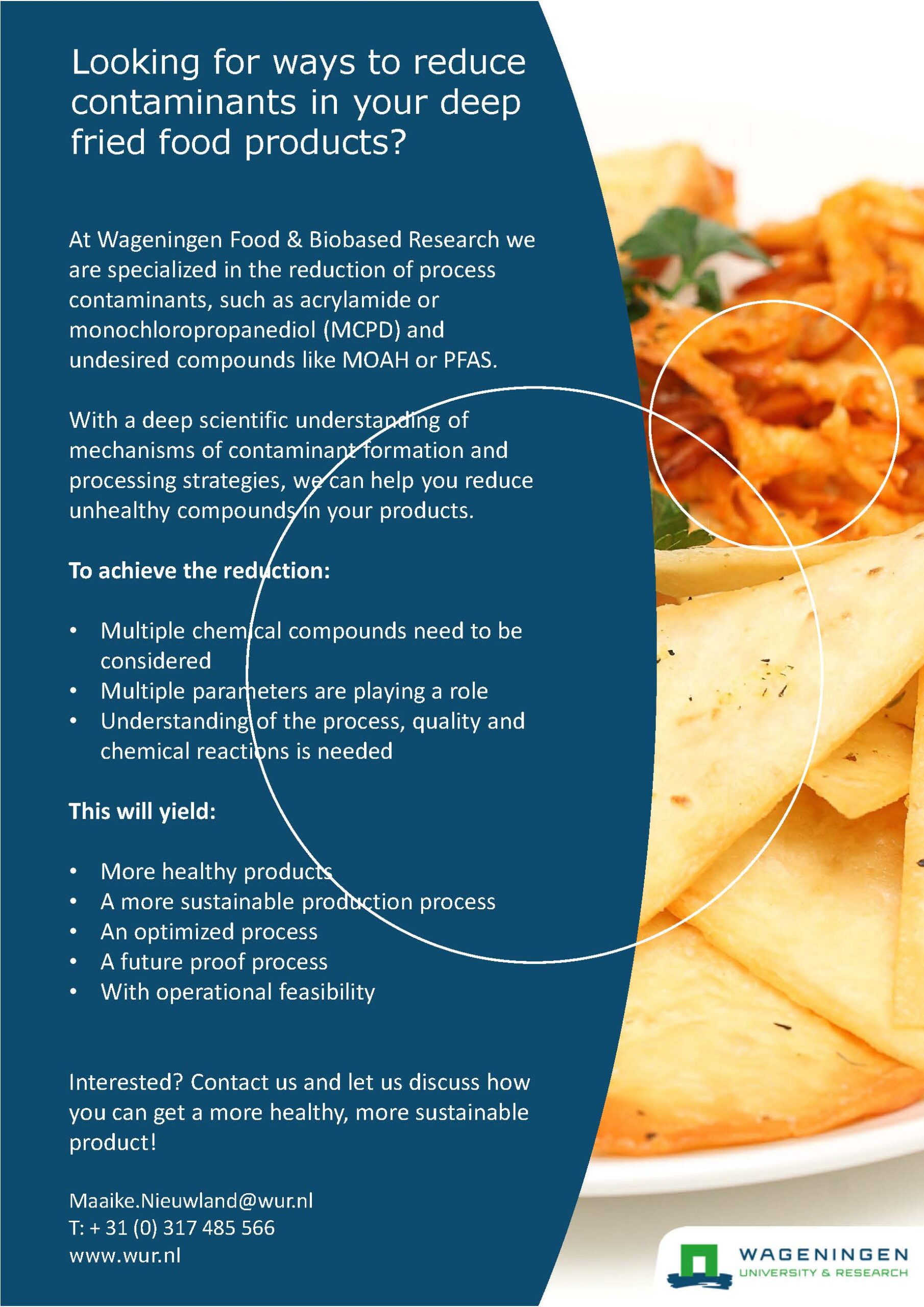 To reduce contaminants, we build mechanistic understanding of contaminant formation during processing, and develop strategies to monitor, prevent, reduce or remove process contaminants. Examples are monitoring of MOAHs (mineral oil aromatic hydrocarbons) in oils, investigation of acrylamide formation with alternative frying technologies or recipe optimisation to reduce MCPD (monochloropropanediol) esters. Scientific insights combined with fast measurements to monitor contaminants level can help in an efficient mitigation strategy for safe consumer products.