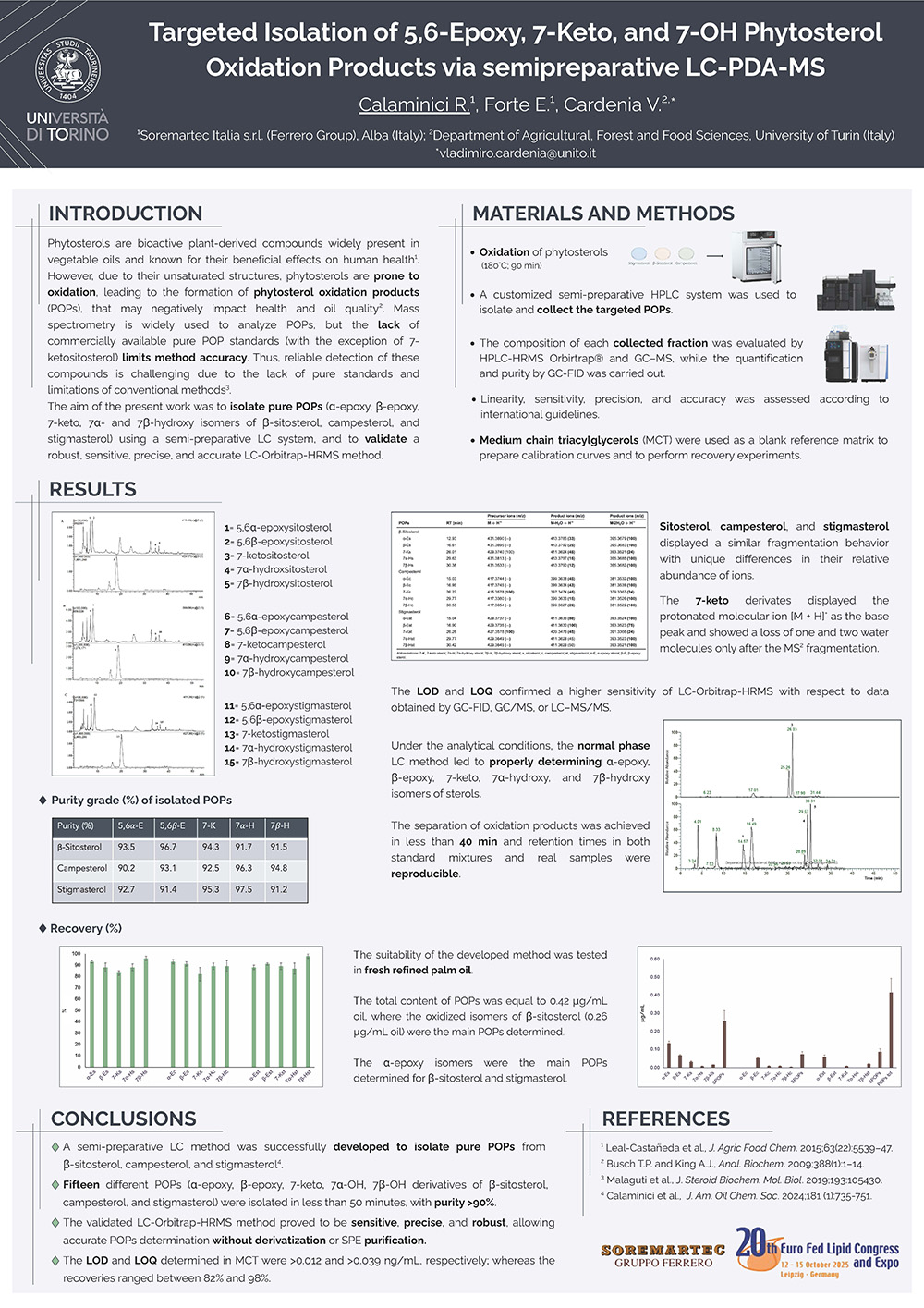 The aim of the present work was to isolate pure POPs (α-epoxy, β-epoxy, 7-keto, 7α- and 7β-hydroxy isomers of β-sitosterol, campesterol, and stigmasterol) using a semi-preparative LC system, and to validate a robust, sensitive, precise, and accurate LC-Orbitrap-HRMS method.