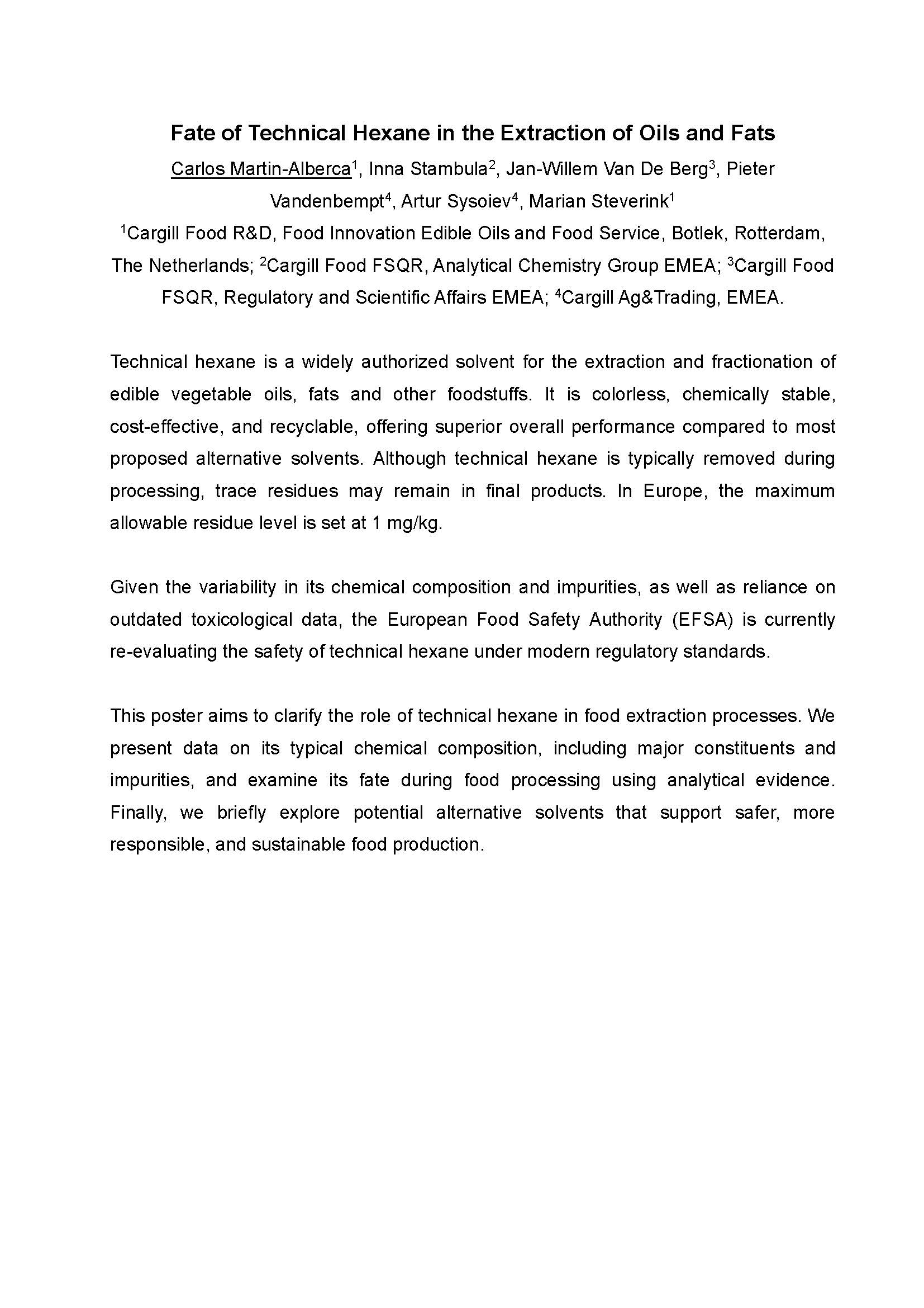 This poster aims to clarify the role of technical hexane in food extraction processes. We present data on its typical chemical composition, including major constituents and impurities, and examine its fate during food processing using analytical evidence. Finally, we briefly explore potential alternative solvents that support safer, more responsible, and sustainable food production.