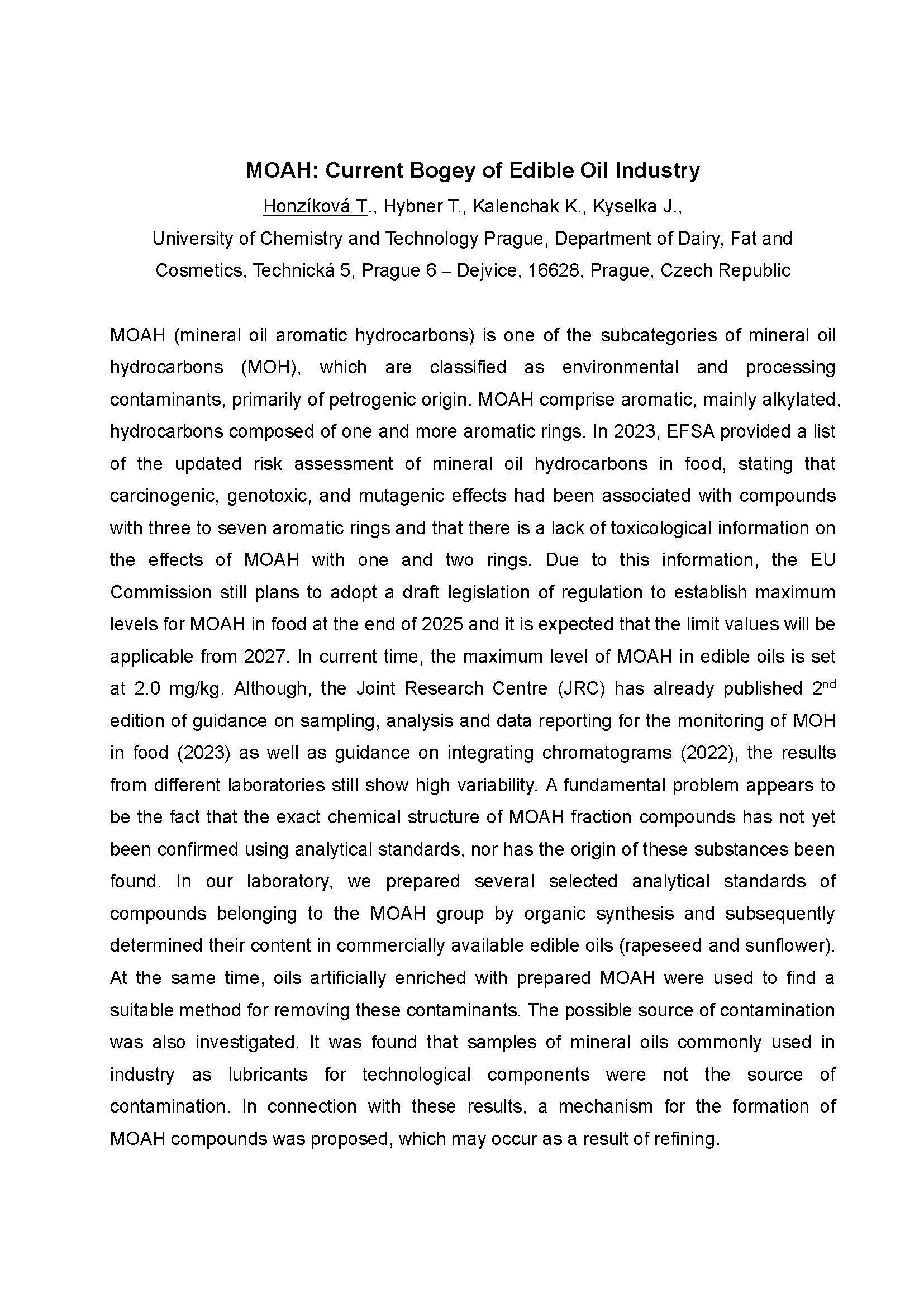 Due to this information, the EU Commission still plans to adopt a draft legislation of regulation to establish maximum levels for MOAH in food at the end of 2025 and it is expected that the limit values will be applicable from 2027. In current time, the maximum level of MOAH in edible oils is set at 2.0 mg/kg. Although, the Joint Research Centre (JRC) has already published 2nd edition of guidance on sampling, analysis and data reporting for the monitoring of MOH in food (2023) as well as guidance on integrating chromatograms (2022), the results from different laboratories still show high variability. A fundamental problem appears to be the fact that the exact chemical structure of MOAH fraction compounds has not yet been confirmed using analytical standards, nor has the origin of these substances been found. In our laboratory, we prepared several selected analytical standards of compounds belonging to the MOAH group by organic synthesis and subsequently determined their content in commercially available edible oils (rapeseed and sunflower). At the same time, oils artificially enriched with prepared MOAH were used to find a suitable method for removing these contaminants. The possible source of contamination was also investigated. It was found that samples of mineral oils commonly used in industry as lubricants for technological components were not the source of contamination. In connection with these results, a mechanism for the formation of MOAH compounds was proposed, which may occur as a result of refining.