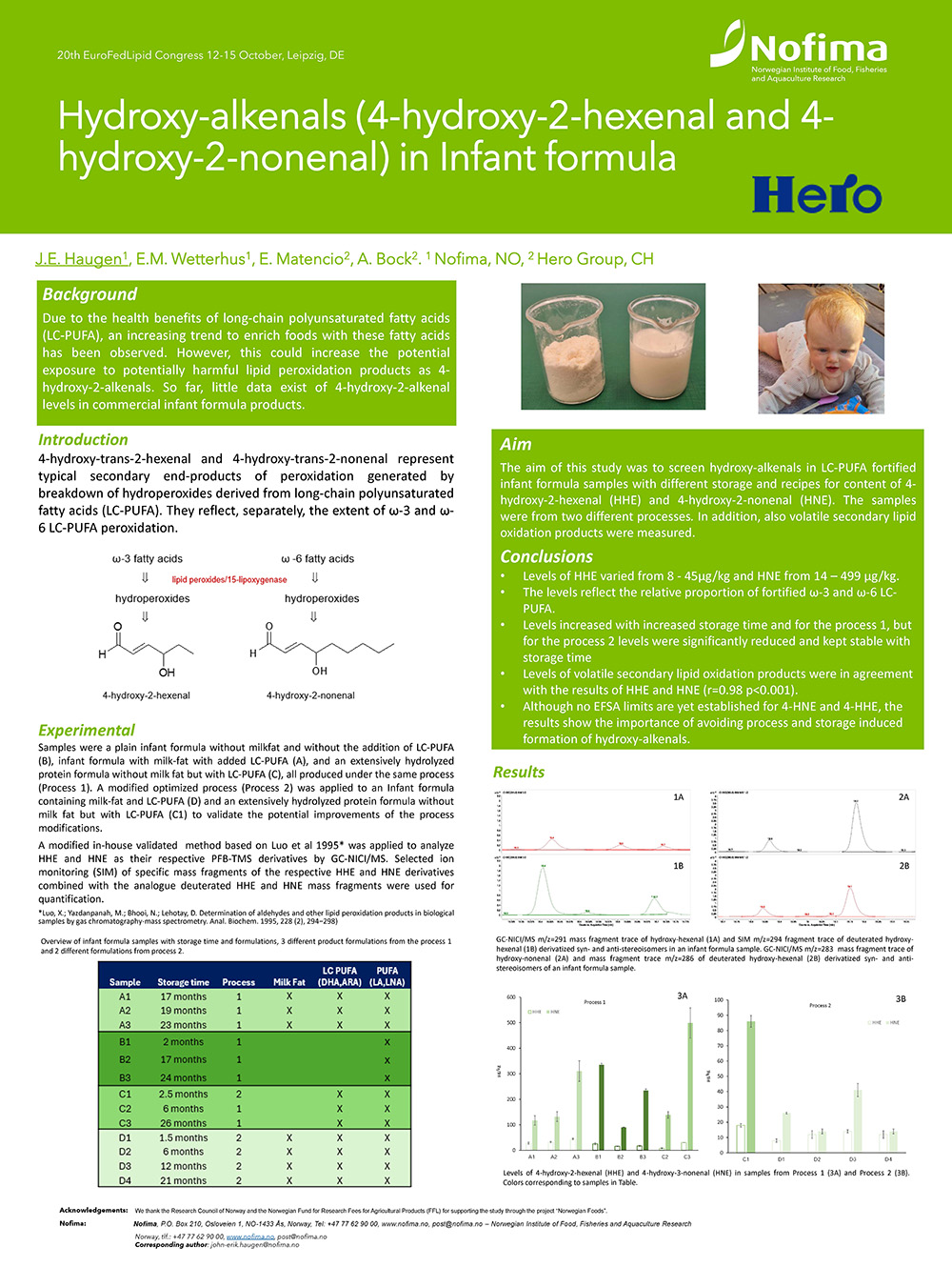 Levels of HHE varied from 8 – 45 µg/kg and HNE from 14 – 449 µg/kg. For one of the production processes levels increased with decreasing shelf life. For the other process, levels kept low and fairly stable with decreasing shelf life. The levels found reflect the relative proportion of fortified ω-3 and ω-6 LC-PUFA. Levels of volatile secondary lipid oxidation products were in agreement with the results of HHE and HNE (r=0.98 p<0.001). Although no EFSA limits are yet established for 4-HNE and 4-HHE, the results show the importance of avoiding process and storage induced formation.