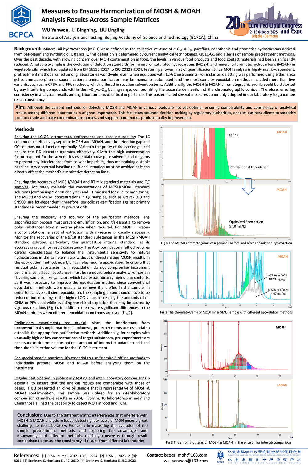 Mineral oil hydrocarbons (MOH) were defined as the collective mixture of n-C10–n-C50 paraffins, naphthenic and aromatics hydrocarbons derived from petroleum and synthetic oils. Basically, this definition is determined by current analytical technologies, i.e. LC-GC and a series of sample pretreatment methods. Over the past decade, with growing concern over MOH contamination in food, the levels in various food products and food contact materials had been significantly reduced. A notable example is the evolution of detection standards for mineral oil saturated hydrocarbons (MOSH) and mineral oil aromatic hydrocarbons (MOAH) in vegetable oils, which had updated from EN 16995:2017 to ISO 20122:2024, featuring a lower limit of quantification. Since MOH analysis is highly matrix-dependent, pretreatment methods varied among laboratories worldwide, even when equipped with LC-GC instruments. For instance, defatting was performed using either silica gel column adsorption or saponification; alumina purification may be manual or automated; and the most complex epoxidation methods included more than five variants, such as m-CPBA and PFA methods, which differed in reaction solvent systems. Additionally, the MOSH & MOAH chromatographic profile could be distorted by any interfering compounds within the n-C10–n-C50 boiling range, compromising the accurate delineation of the chromatographic contour. Therefore, ensuring consistency in analytical results among laboratories is of critical importance. This poster shared several measures commonly adopted in our laboratory to guarantee result consistency.