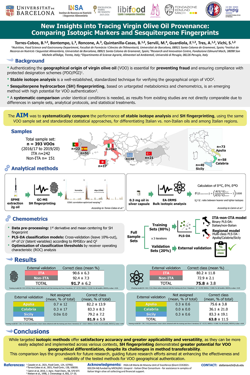 While targeted isotopic methods offer satisfactory accuracy and greater applicability and versatility, as they can be more easily adapted and implemented across various contexts, SH fingerprinting demonstrated greater potential for VOO geographical differentiation, despite its challenges in method transferability. This comparison lays the groundwork for future research, guiding future research efforts aimed at enhancing the effectiveness and reliability of the tested methods for VOO geographical authentication.