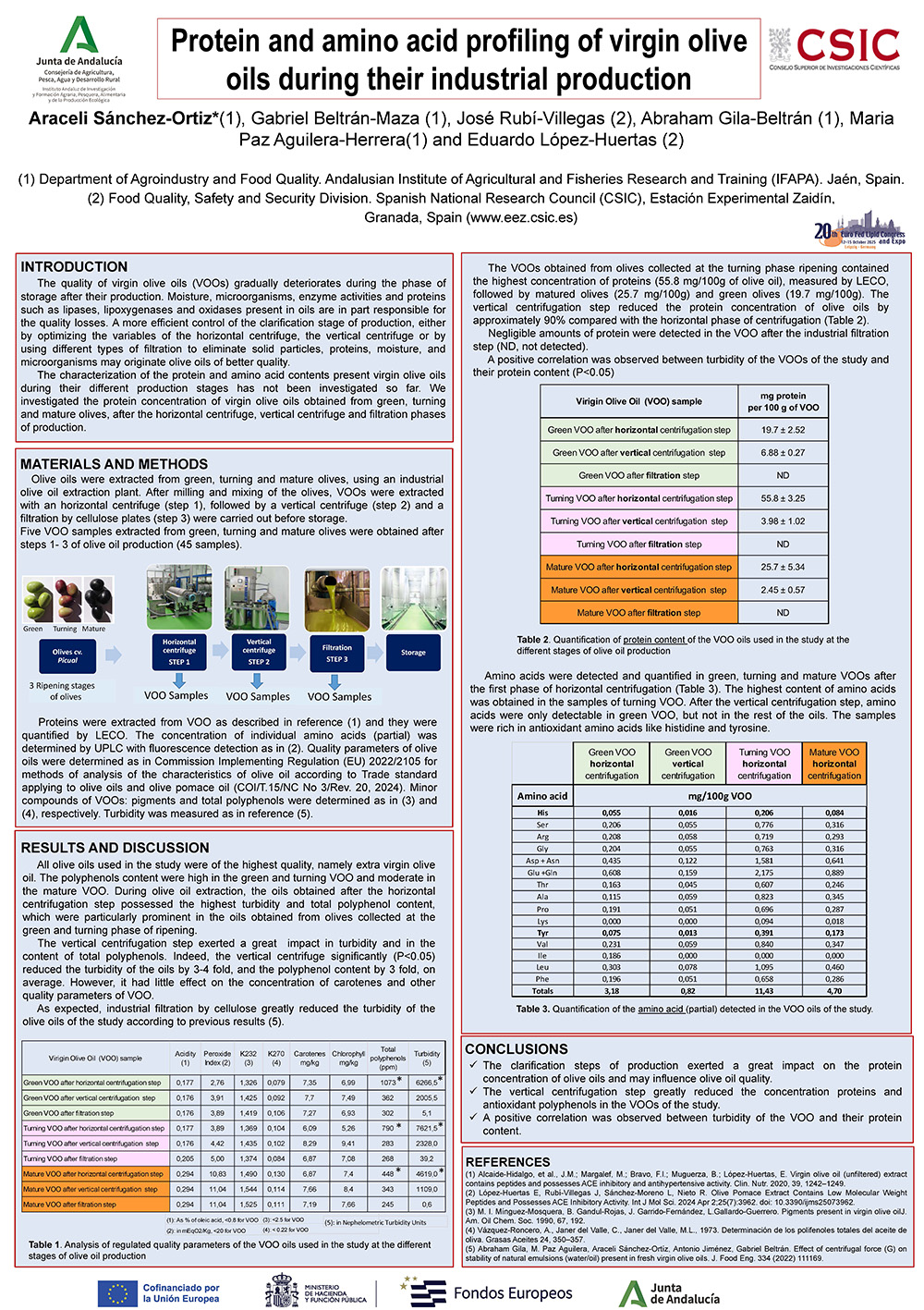 The characterization of the protein and amino acid contents present virgin olive oils during their different production stages has not been investigated so far. We investigated the protein concentration of virgin olive oils obtained from green, turning and mature olives, after the horizontal centrifuge, vertical centrifuge and filtration phases of production. Olive oils from olives collected at the turning phase ripening contained the highest concentration of proteins (55,8 mg/100g of olive oil), measured by LECO, followed by matured (25,7 mg/100g) and green olives (19,7 mg/100g). The vertical centrifugation step reduced the protein concentration of olive oils by approximately 90% compared with the horizontal phase of centrifugation. The industrial filtration step originated olive oils with negligible amounts of protein. The clarification steps of production exerts a great impact on the protein concentration of olive oils and may influence olive oil quality.