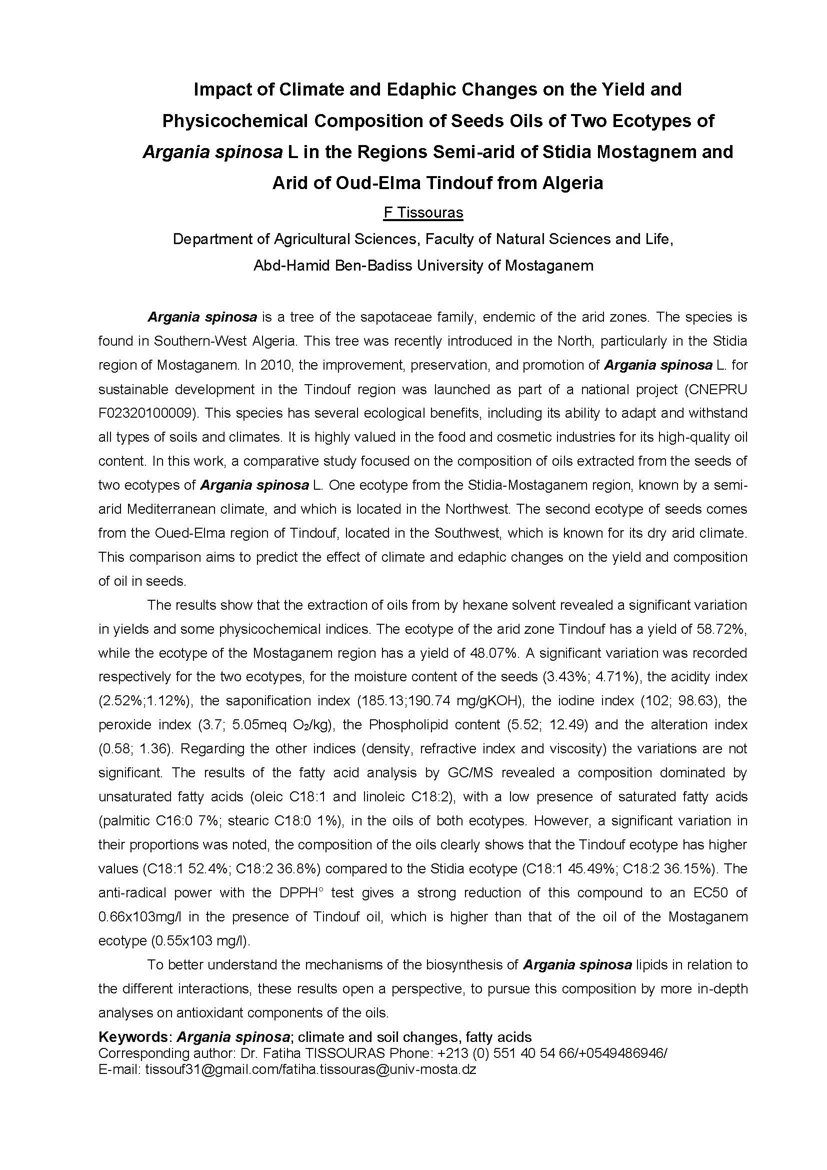 Keywords: Argania spinosa; climate and soil changes, fatty acids