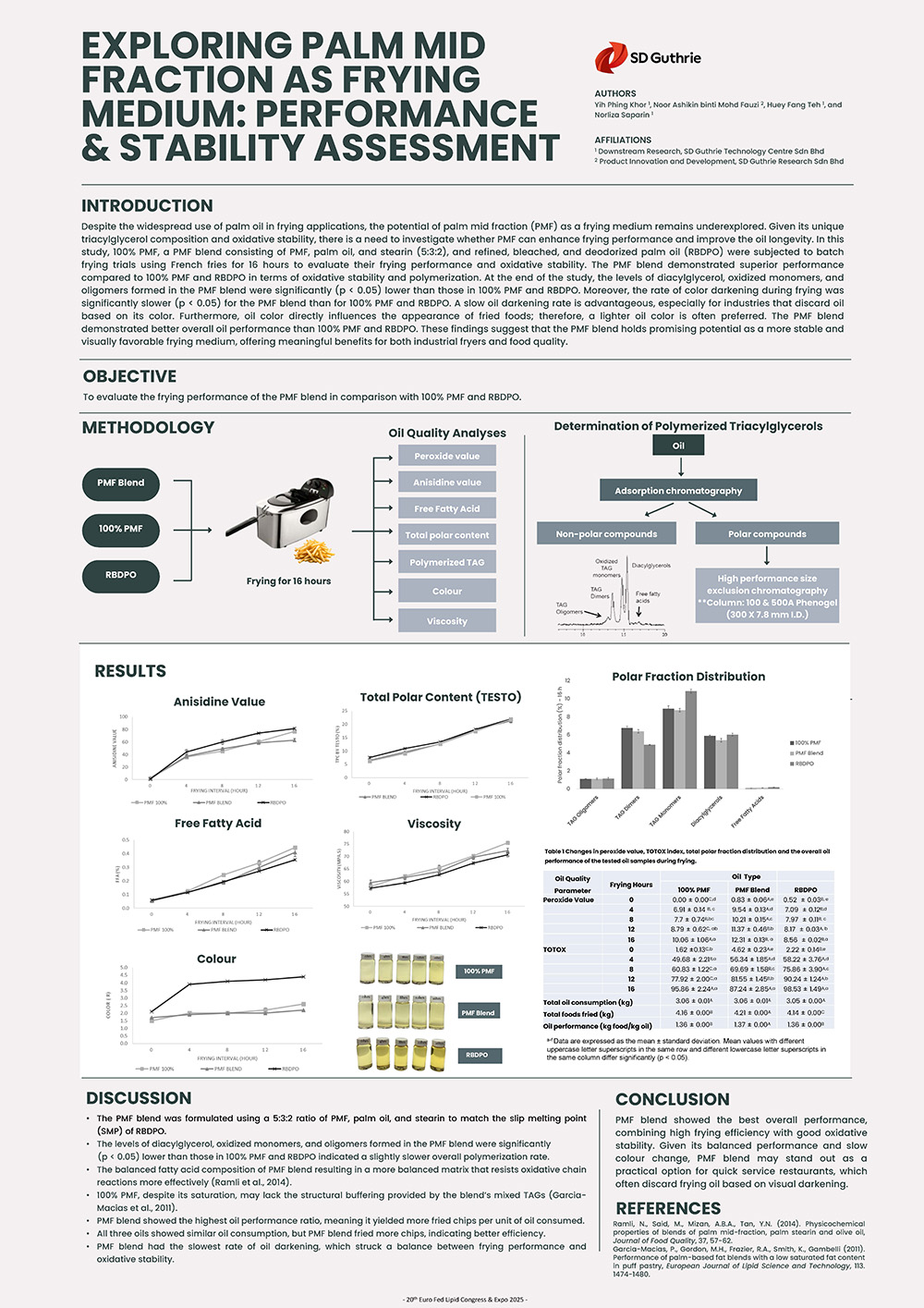 Despite the widespread use of palm oil in frying applications, the potential of palm mid fraction (PMF) as a frying medium remains underexplored. Given its unique triacylglycerol composition and oxidative stability, there is a need to investigate whether PMF can enhance frying performance and improve the oil longevity. In this study, 100% PMF, a PMF blend consisting of PMF, palm oil, and stearin (5:3:2), and refined, bleached, and deodorized palm oil (RBDPO) were subjected to batch frying trials using French fries for 16 hours to evaluate their frying performance and oxidative stability.