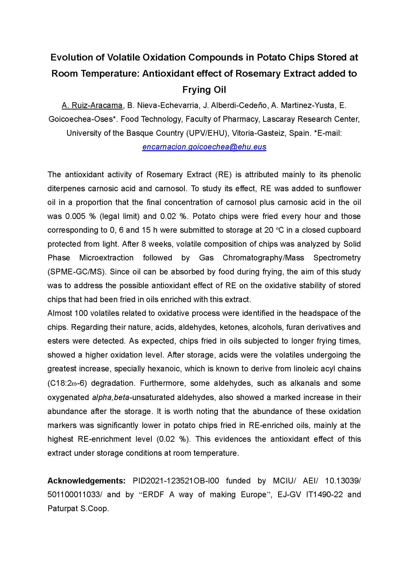 The antioxidant activity of Rosemary Extract (RE) is attributed mainly to its phenolic diterpenes carnosic acid and carnosol. To study its effect, RE was added to sunflower oil in a proportion that the final concentration of carnosol plus carnosic acid in the oil was 0.005 % (legal limit) and 0.02 %. Potato chips were fried every hour and those corresponding to 0, 6 and 15 h were submitted to storage at 20 ºC in a closed cupboard protected from light. After 8 weeks, volatile composition of chips was analyzed by Solid Phase Microextraction followed by Gas Chromatography/Mass Spectrometry (SPME-GC/MS). Since oil can be absorbed by food during frying, the aim of this study was to address the possible antioxidant effect of RE on the oxidative stability of stored chips that had been fried in oils enriched with this extract.