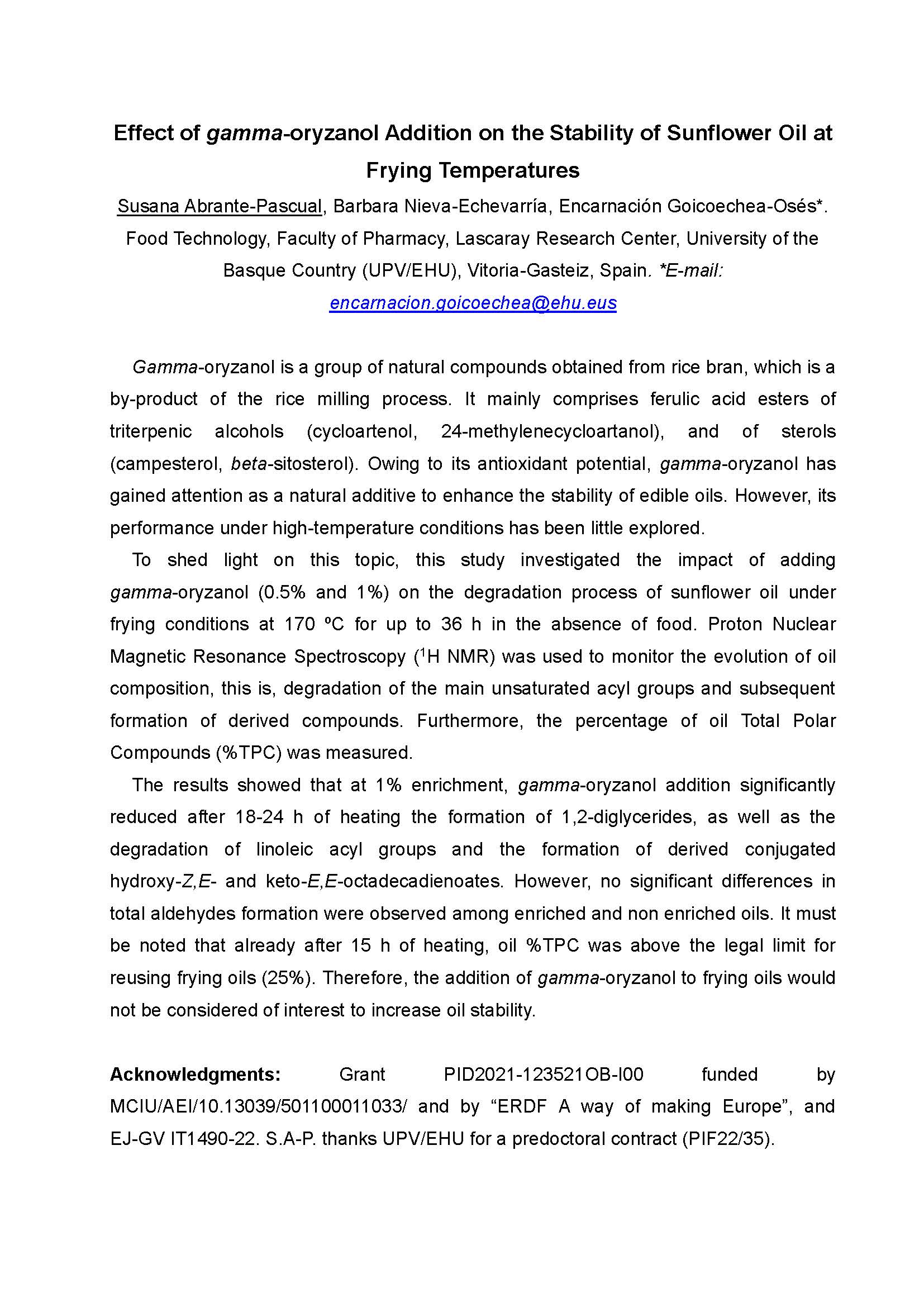 To shed light on this topic, this study investigated the impact of adding gamma-oryzanol (0.5% and 1%) on the degradation process of sunflower oil under frying conditions at 170 ºC for up to 36 h in the absence of food. Proton Nuclear Magnetic Resonance Spectroscopy ( 1H NMR) was used to monitor the evolution of oil composition, this is, degradation of the main unsaturated acyl groups and subsequent formation of derived compounds. Furthermore, the percentage of oil Total Polar Compounds (%TPC) was measured.