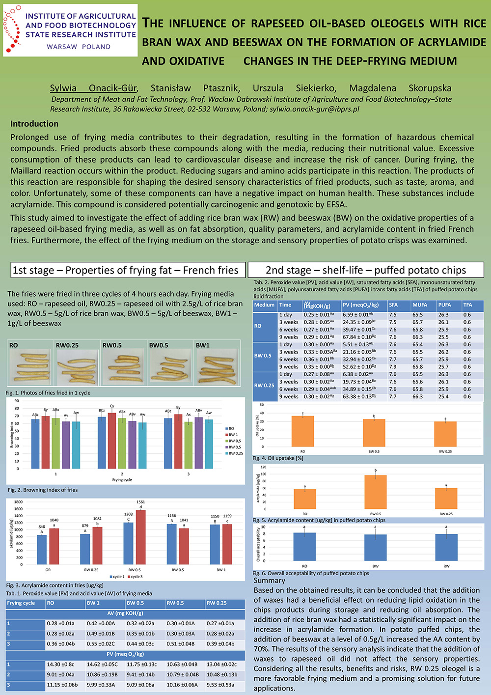 This study aimed to investigate the effect of rice bran wax (RW) and beeswax (BW) on the oxidative properties of a rapeseed oil-based frying medium, as well as on the fat absorption, quality parameters, and acrylamide content of fried French fries. Furthermore, the effect of the frying medium on the storage and sensory properties of potato crisps was examined.