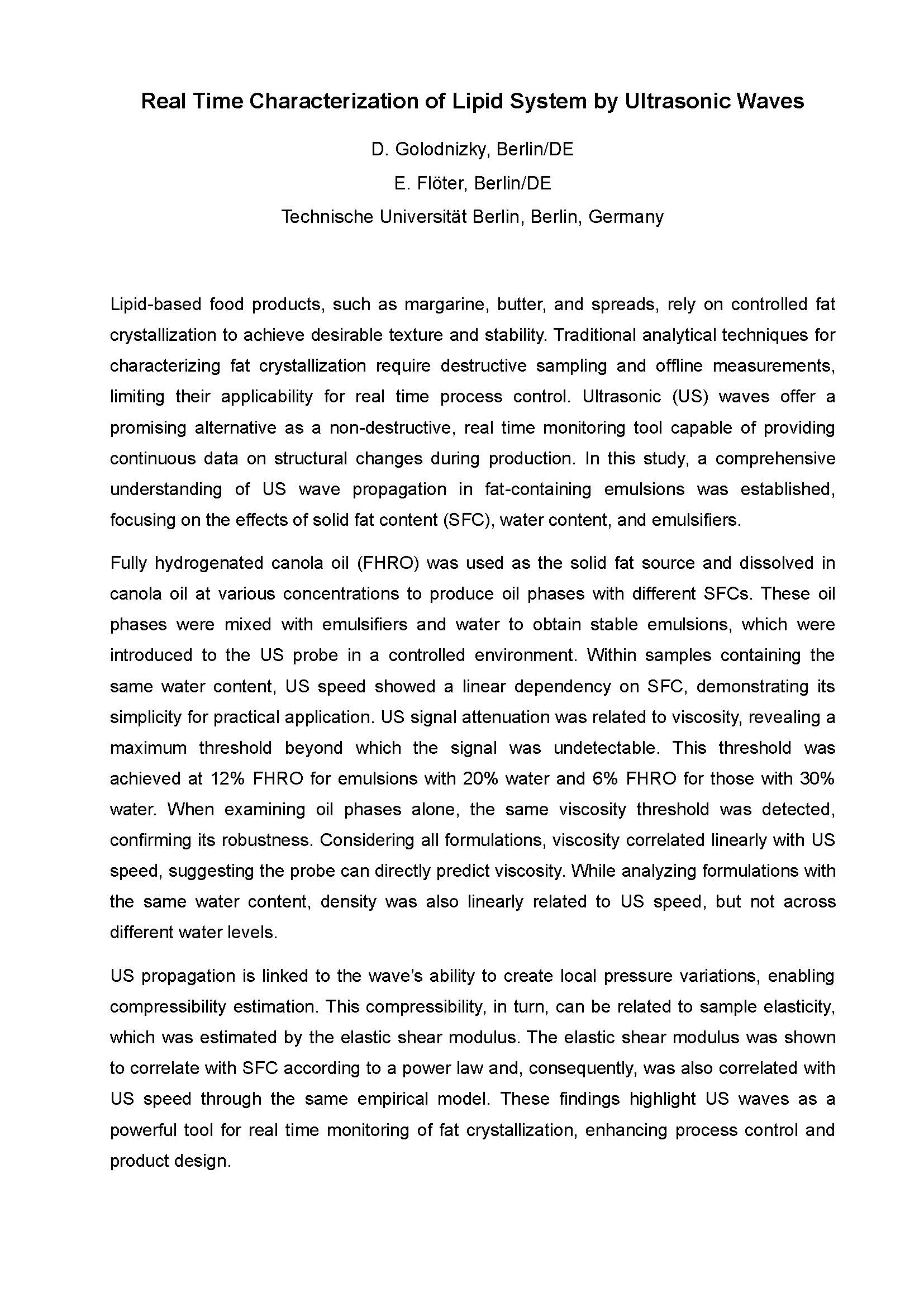 Lipid-based food products, such as margarine, butter, and spreads, rely on controlled fat crystallization to achieve desirable texture and stability. Traditional analytical techniques for characterizing fat crystallization require destructive sampling and offline measurements, limiting their applicability for real time process control. Ultrasonic (US) waves offer a promising alternative as a non-destructive, real time monitoring tool capable of providing continuous data on structural changes during production. In this study, a comprehensive understanding of US wave propagation in fat-containing emulsions was established, focusing on the effects of solid fat content (SFC), water content, and emulsifiers.