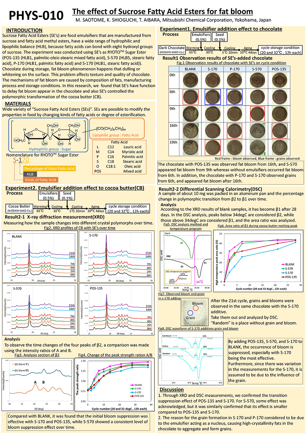 We evaluated fat bloom suppressant effect in CB with SE’s. The chocolate with SE’s was kept on the cycle storage condition (20 and 32 degC, 12h each). As a result, the chocolate with POS-135 was observed fat bloom from 13th, and S-570 appeared fat bloom from 9th whereas without emulsifiers occurred fat bloom from 6th. In addition, the chocolate with P-170 and S-170 observed grains from 6th, and appeared fat bloom after 14th. In conclusion SE’s have function to delay fat bloom appear in the chocolate. Also, we found that SE’s suppress the polymorphic transformation by X-ray diffraction measurement (XRD) and differential scanning calorimetry (DSC).