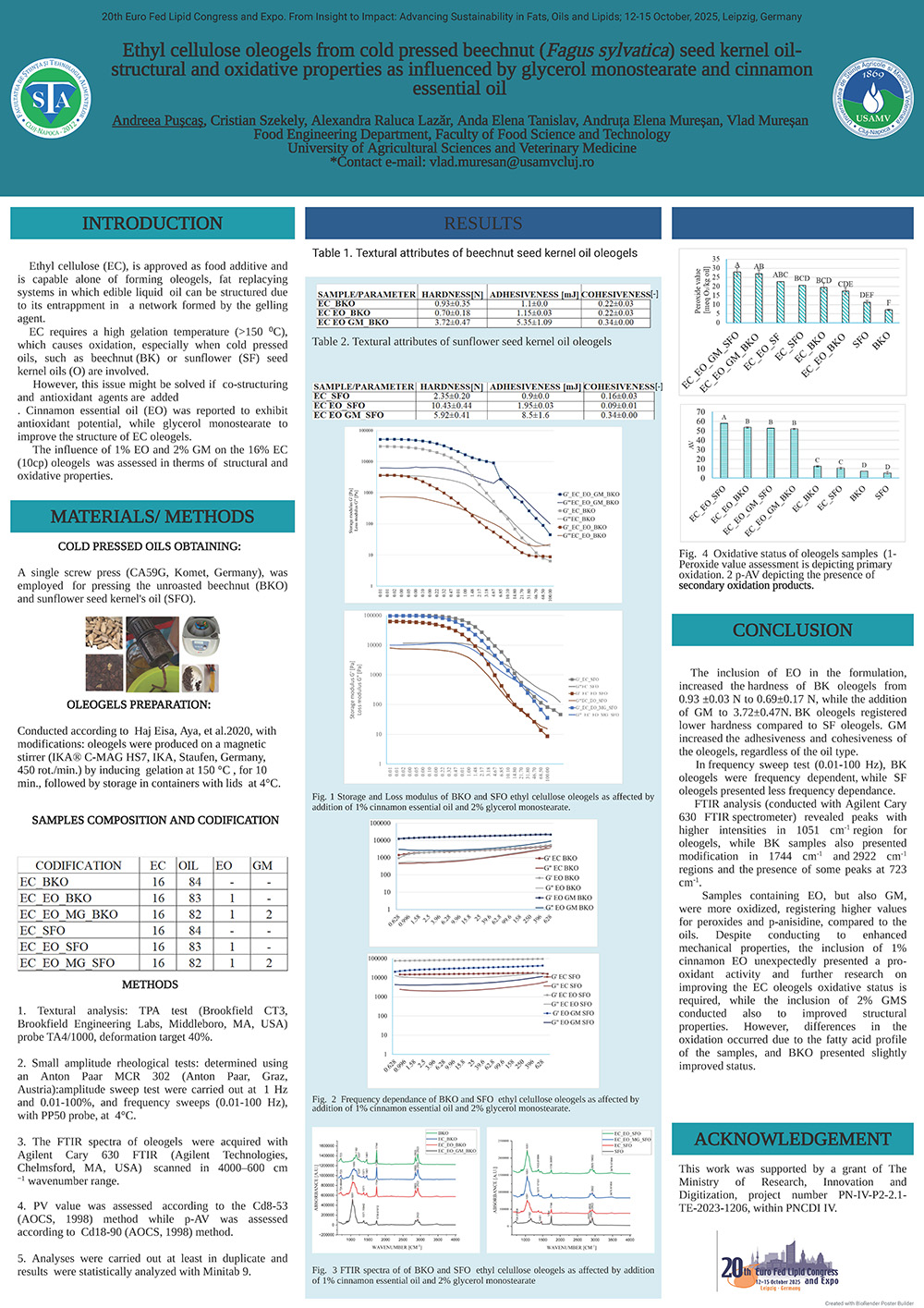 The current study explores the impact of adding 1% cinnamon essential oil (EO) and 2% glycerol monostearate (GM) to the 16%EC (10cp) oleogels in terms of structural (textural, rheological) and oxidative status. The inclusion of EO in the formulation, increased the hardness of BK oleogels from 0.93 ±0.03 N to 0.69±0.17 N, while the addition of GMS to 3.72±0.47N. BK oleogels registered lower hardness compared to SF oleogels. GMS increased the adhesiveness and cohesiveness of the oleogels, regardless of the oil type. In frequency sweep test (0.01-100 Hz), BK oleogels were frequency dependent, except for BK_EO_GM. FTIR analysis (conducted with Agilent Cary 630 FTIR spectrometer) revealed peaks with higher intensities in 1051 cm-1 region for oleogels, while BK samples also presented modification in 1744 cm-1 and 2922 cm-1 regions and the presence of some peaks at 723 cm-1 . Beechnut seed kernel oil registered a PV of 7.12±0.4 meq O₂/kg oil and AV of 7.09±0.13, while for sunflower oil, PV and AV were 10.69 meq O₂/kg oil and 5.41. Samples containing EO, but also GM, were more oxidized, registering higher values for peroxides and p-anisidine, compared to the oils. Despite conducting to enhanced mechanical properties, the inclusion of 1% cinnamon EO unexpectedly presented a pro-oxidant activity and further research on improving the EC oleogels oxidative status is required, while the inclusion of 2% GMS conducted also to improved structural properties.