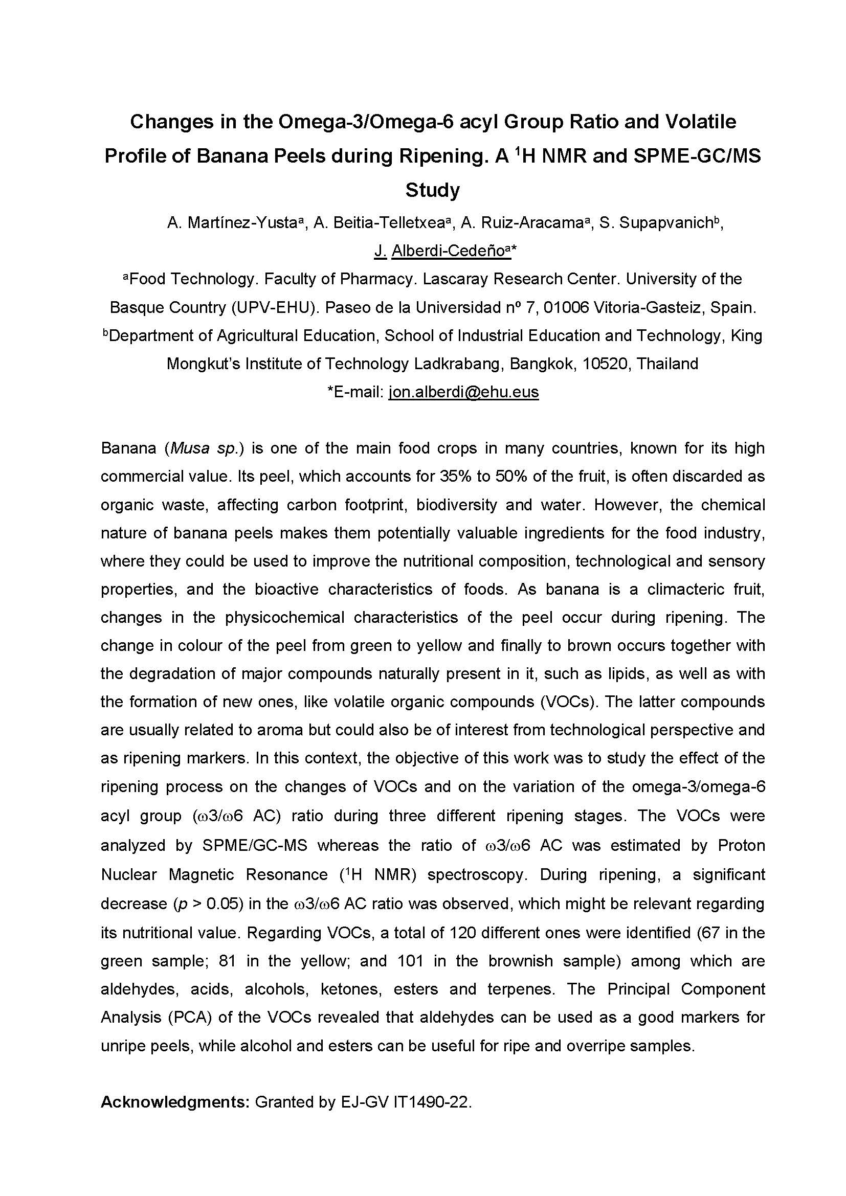 Banana (Musa sp.) is one of the main food crops in many countries, known for its high commercial value. Its peel, which accounts for 35% to 50% of the fruit, is often discarded as organic waste, affecting carbon footprint, biodiversity and water. However, the chemical nature of banana peels makes them potentially valuable ingredients for the food industry, where they could be used to improve the nutritional composition, technological and sensory properties, and the bioactive characteristics of foods. As banana is a climacteric fruit, changes in the physicochemical characteristics of the peel occur during ripening. The change in colour of the peel from green to yellow and finally to brown occurs together with the degradation of major compounds naturally present in it, such as lipids, as well as with the formation of new ones, like volatile organic compounds (VOCs). The latter compounds are usually related to aroma but could also be of interest from technological perspective and as ripening markers. In this context, the objective of this work was to study the effect of the ripening process on the changes of VOCs and on the variation of the omega-3/omega-6 acyl group (3/6 AC) ratio during three different ripening stages. The VOCs were analyzed by SPME/GC-MS whereas the ratio of 3/6 AC was estimated by Proton Nuclear Magnetic Resonance (1H NMR) spectroscopy. During ripening, a significant decrease (p > 0.05) in the 3/6 AC ratio was observed, which might be relevant regarding its nutritional value. Regarding VOCs, a total of 120 different ones were identified (67 in the green sample; 81 in the yellow; and 101 in the brownish sample) among which are aldehydes, acids, alcohols, ketones, esters and terpenes. The Principal Component Analysis (PCA) of the VOCs revealed that aldehydes can be used as a good markers for unripe peels, while alcohol and esters can be useful for ripe and overripe samples.