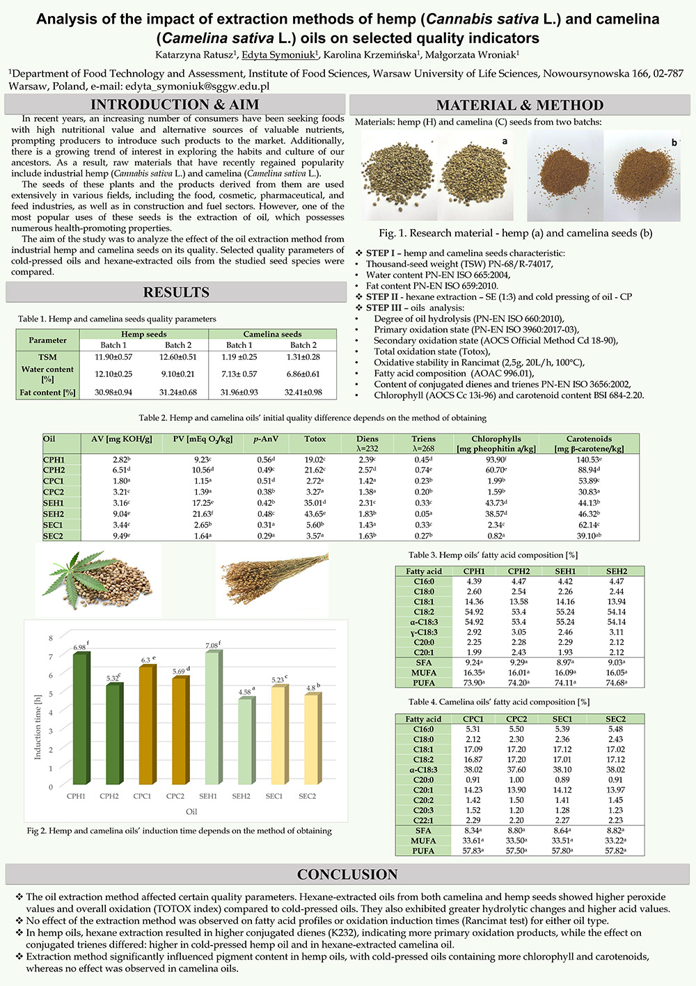 The study concluded that both hemp and camelina oils are valuable dietary fats, rich in essential fatty acids and characterized by a favorable balance of n-6 to n-3 fatty acids. Camelina oil, with its exceptionally high ALA content and low n-6/n-3 ratio, stands out as particularly beneficial for health promotion. Both oils meet quality standards and may serve as alternatives to more common edible oils, offering promising applications in the functional food and nutraceutical industries. In summary, while the extraction method did not alter the fundamental fatty acid profiles of hemp and camelina oils, it substantially influenced oxidation parameters, pigment content, and the extent of hydrolytic changes. These findings highlight the importance of selecting an appropriate extraction method depending on the intended application and desired quality characteristics of the oil.