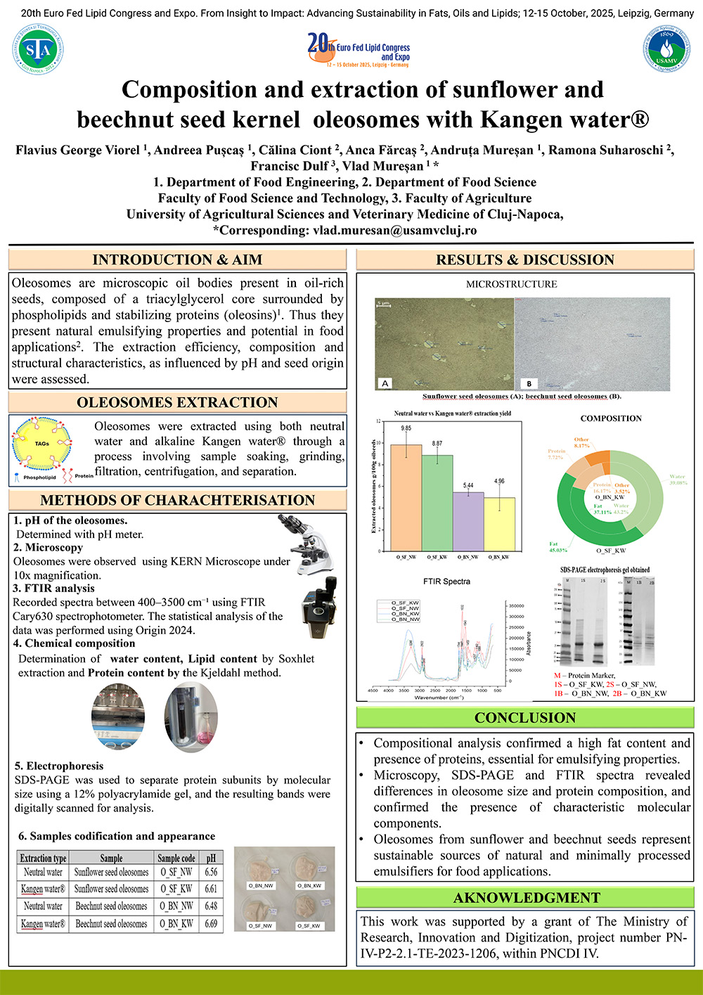 The composition of the oleoseoms was determined with AOAC approved methods, revealling that Beechnut samples contained 43.2% water, 37.11% fat, 16.17% protein, and 3.52% other compounds, while Sunflower samples had 39.08% water, 45.03% fat, 7.72% protein, and 8.17% other compounds, being considered valuable encapsulation media for unsaturated fatty acids. The FTIR (Agilent Technologies, Chelmsford, MA, USA) spectra presented peaks in regions charachteristic for fats, proteins, and phospholipids (2920–2850 cm⁻¹ and 1740 cm⁻¹, 1650 cm⁻¹ and 1540 cm⁻¹ , 1200–900 cm⁻¹ respectively). Oleosomes dimensions were between 0,87–3,32 μm, as determined with Kern, OBE-1 microscope (KERN & SOHN GmbH, Balingen, Germany) under x10 magnification. SDS-PAGE showed a broad distribution of protein bands, particularly in the 15–30 kDa region, for the Beechnut oleosomes, and a strong band around 15–18 kDa for Sunflower seeds oleosomes, suggesting structural and functional complexity. Oleosomes can be obtained from sustainable and cost efficient sources and will be further employed as natural emulsifiers in food products.