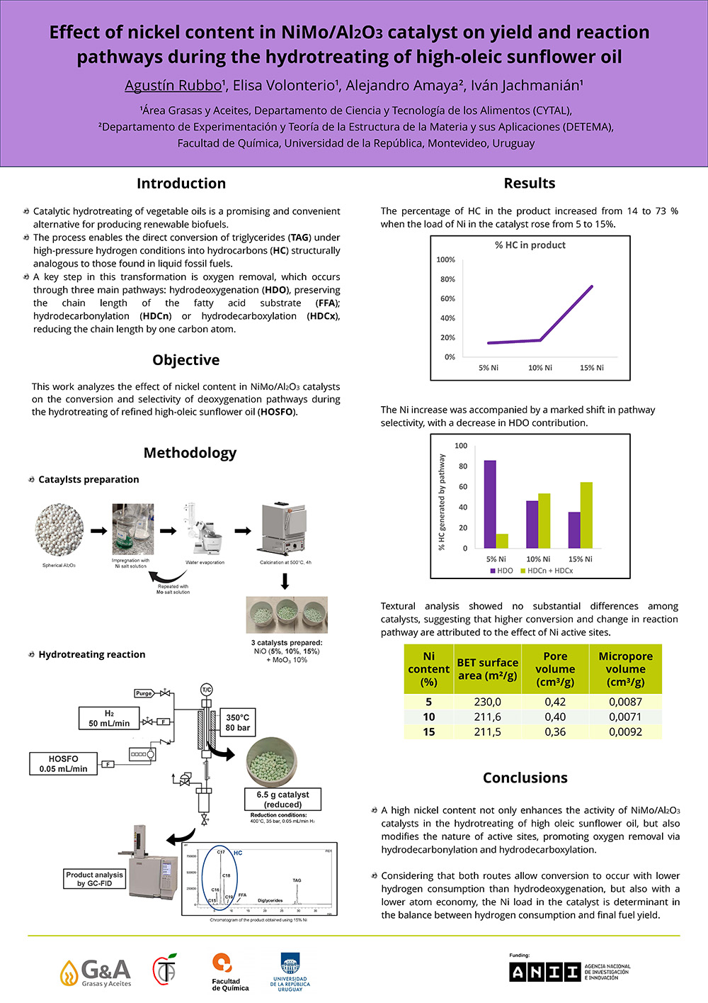 This work analyzes the effect of nickel content in NiMo/Al2O3 catalysts on the conversion and selectivity of deoxygenation pathways during the hydrotreating of refined high-oleic sunflower oil. Catalysts containing 5, 10 and 15% wt/wt Ni and 10% wt/wt Mo were prepared by incipient wetness impregnation on spherical Al2O3. The catalyst (6.5 g) was loaded in a tubular fixed-bed reactor and reduced under a H2 flow of 50 mL/min, at 35 bar and 400°C for 150 min. After catalyst reduction, pressure and temperature were adjusted to 80 bar and 350 ºC, respectively, and the reaction was initiated by feeding oil at a rate of 0.05 mL/min. After 3h of reaction, the product was collected and analyzed by GC-FID.